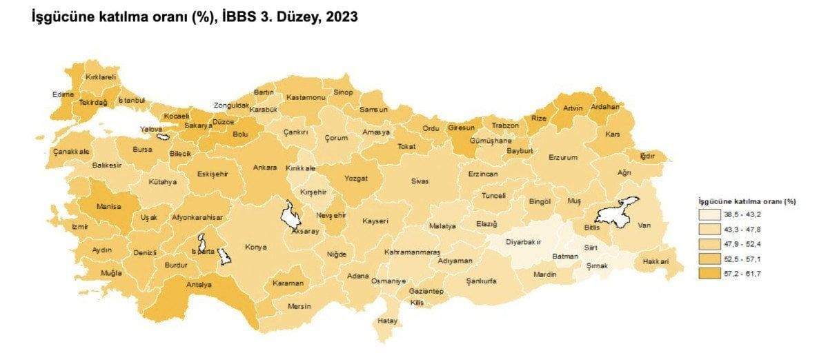 En yüksek işgücüne katılma oranı yüzde 61,7 ile Ardahan ilinde gerçekleşti. En düşük iş gücüne katılma oranı ise yüzde 38,5 ile Siirt ilinde oldu.