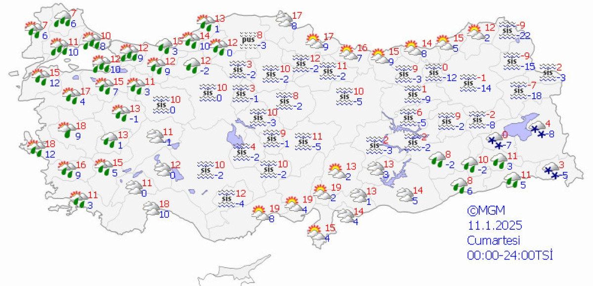 Yurdun iç ve doğu kesimlerinde buzlanma ve don ile birlikte pus ve yer yer sis hadisesinin görüleceği tahmin ediliyor.