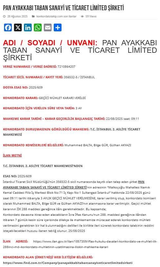 Borçların artması ve nakit akışındaki sorunlar nedeniyle firma, İstanbul 2. Asliye Ticaret Mahkemesi’ne konkordato başvurusunda bulundu. Mahkeme, talebi kabul ederek şirkete 3 aylık geçici mühlet verdi ve süreci denetlemek üzere 3 konkordato komiseri atadı. Komiserler, firmanın mali yapısını inceleyip alacaklılarla görüşmeleri yürütecek ve raporlarını mahkemeye sunacak.