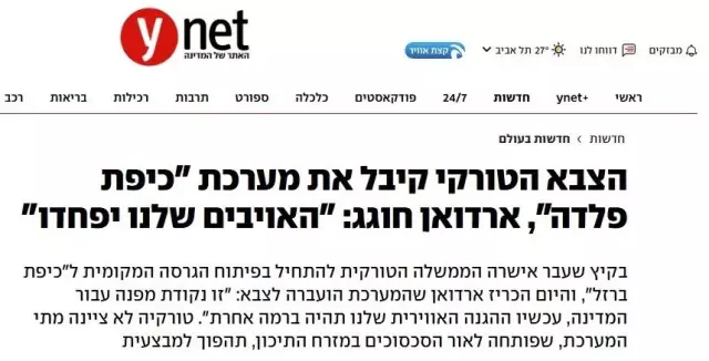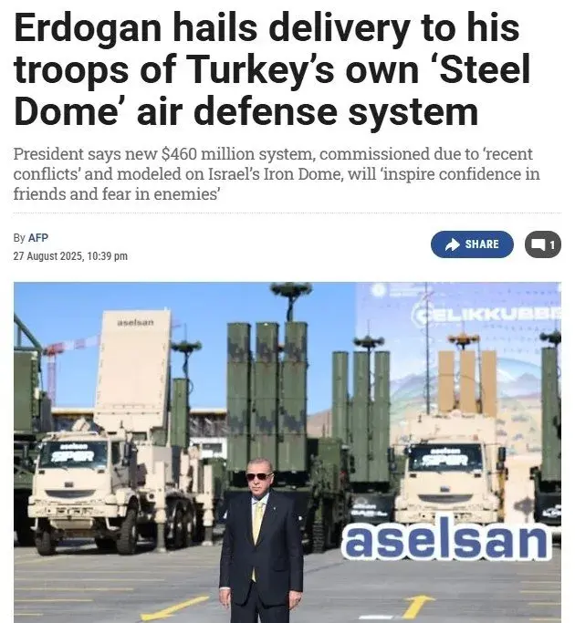 - Yedioth Ahronoth gazetesi ise, “Türk ordusu ‘Çelik Kubbe’ sistemini teslim aldı, Erdoğan kutladı: Düşmanlarımız korkacak” manşetiyle verdiği haberde, Türkiye’nin savunma sanayisinde dışa bağımlılığını azalttığını ve İHA üretiminde lider konuma geldiğini hatırlattı.