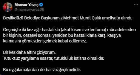 Ankara Büyükşehir Belediye Başkanı Mansur Yavaş, Çalık’ın ameliyata alındığını duyurdu. Yavaş açıklamasında şu ifadeleri kullandı: “Beylikdüzü Belediye Başkanımız Mehmet Murat Çalık ameliyata alındı. Geçmişte iki kez ağır hastalıkla (akut lösemi ve lenfoma) mücadele eden bir kişinin, cezaevi sonrası yeniden bu hastalıklarla karşı karşıya kalmasını görmezden gelmek kabul edilemez. Bir kez daha altını çiziyorum; tutuksuz yargılama esastır, tutukluluk istisna olmalıdır. Bu uygulamalardan derhal vazgeçilmelidir.” dedi.