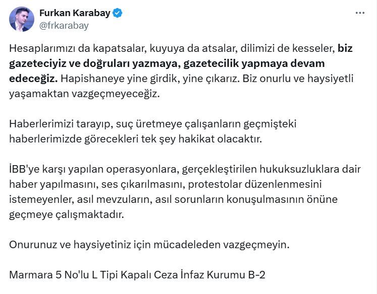 “Hapishaneye yine girdik, yine çıkarız. Biz onurlu ve haysiyetli yaşamaktan vazgeçmeyeceğiz. Haberlerimizi tarayıp, suç üretmeye çalışanların geçmişteki haberlerimizde görecekleri tek şey hakikat olacaktır. İBB’ye karşı yapılan operasyonlara, gerçekleştirilen hukuksuzluklara dair haber yapılmasını, ses çıkarılmasını, protestolar düzenlenmesini istemeyenler, asıl mevzuların, asıl sorunların konuşulmasının önüne geçmeye çalışmaktadır. Onurunuz ve haysiyetiniz için mücadeleden vazgeçmeyin.”