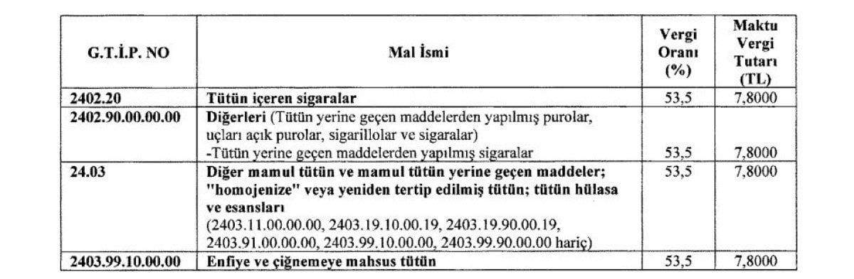 Buna göre tütün ve tütün yerine geçen purolar ve sigaralara Özel Tüketim Vergisi ile maktu vergi tutarında artış yapıldı.
