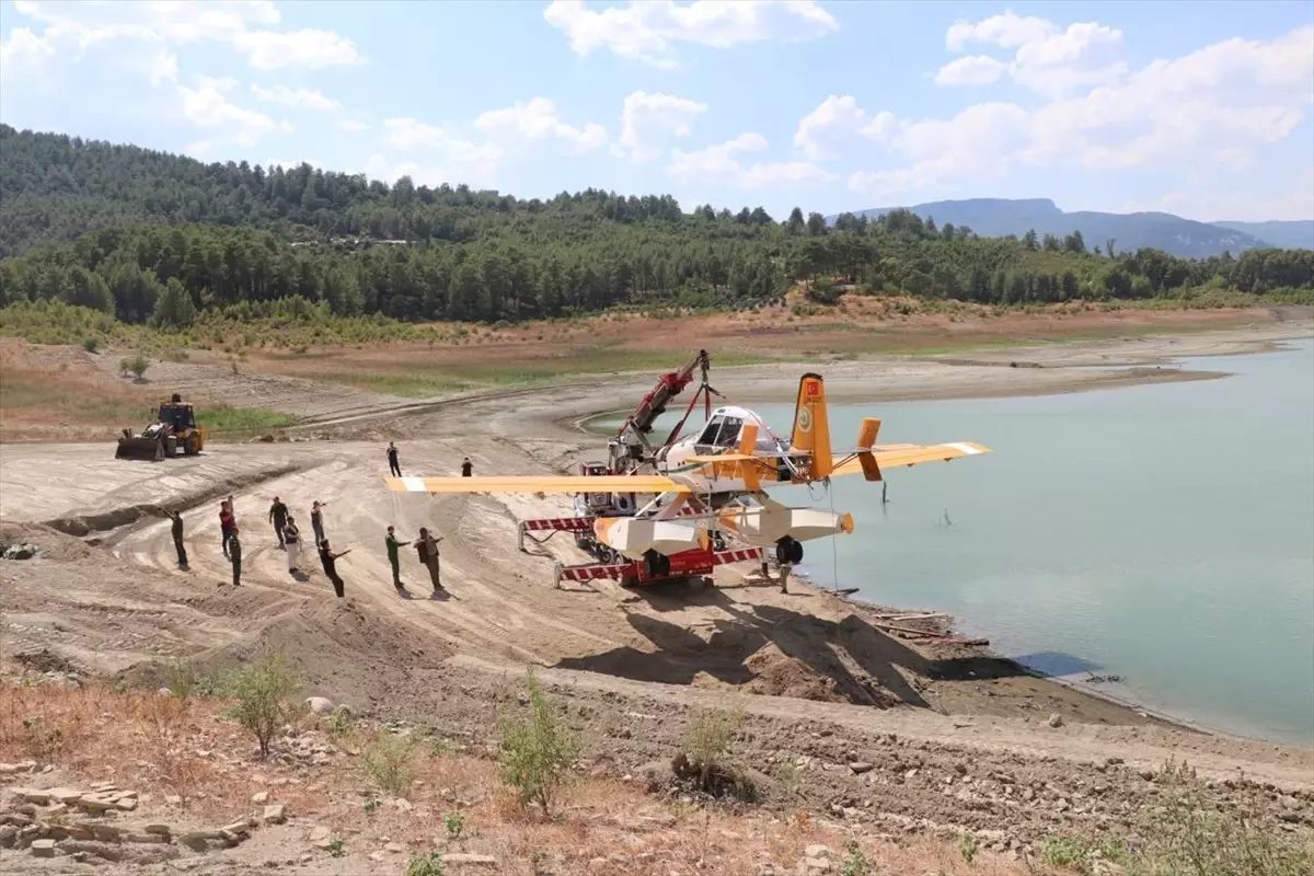 Karacören Barajı Gölü’nde kaza kırıma uğrayan Orman Genel Müdürlüğüne ait yangın söndürme eğitim uçağı, Antalya’dan gelen teknik ekiplerin vinçle yaptığı kurtarma çalışmalarının ardından gölden çıkarıldı.