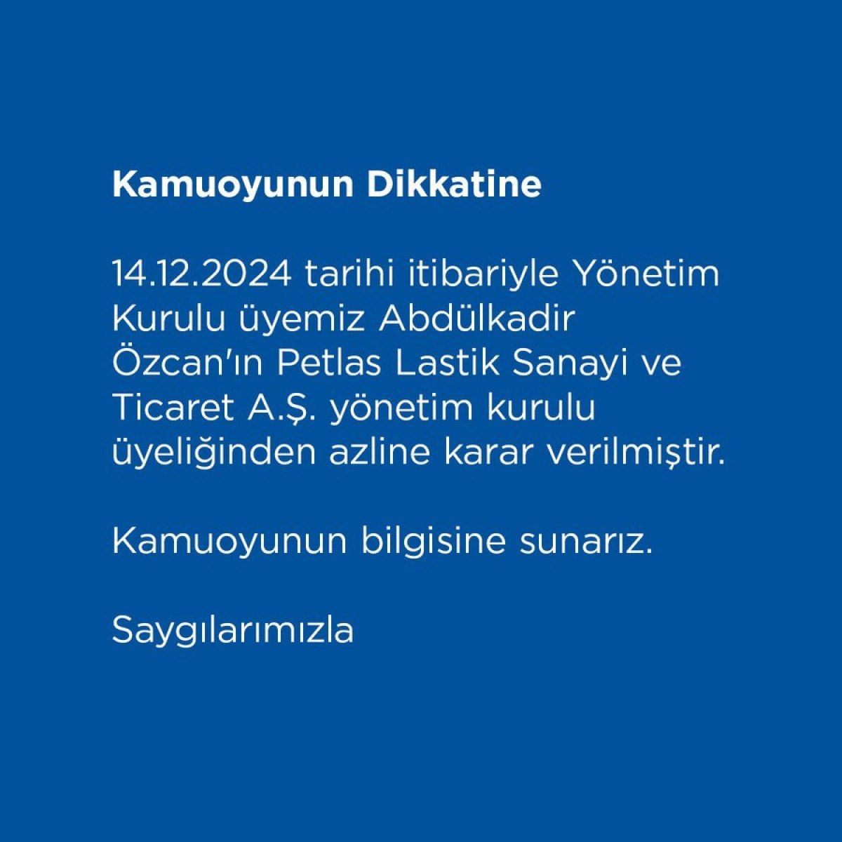 Petlas bir açıklama yaparak, 14 Aralık 2024 tarihi itibariyle Yönetim Kurul Üyesi Abdülkadir Abdulkadir Özcan’ın Petlas Lastik Sanayi ve Ticaret A.Ş. yönetim kurulu üyeliğinden azline karar verildiğini açıkladı.