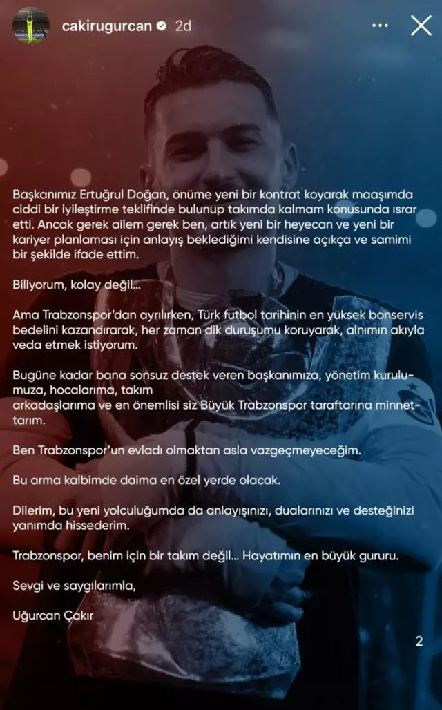 Bordo-mavili kulüpten ayrılmanın kolay olmadığını dile getiren Uğurcan, “Trabzonspor’dan ayrılırken Türk futbol tarihinin en yüksek bonservis bedelini kazandırarak, her zaman dik duruşumu koruyarak, alnımın akıyla veda etmek istiyorum” ifadelerini kullandı.