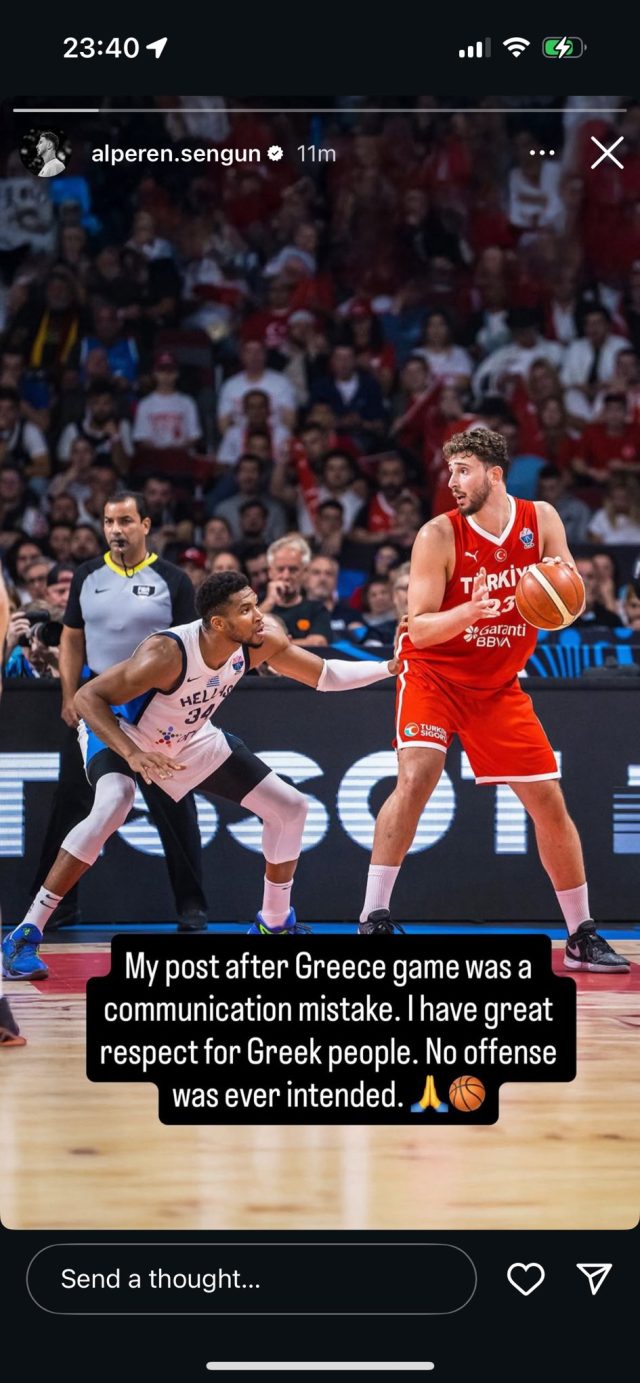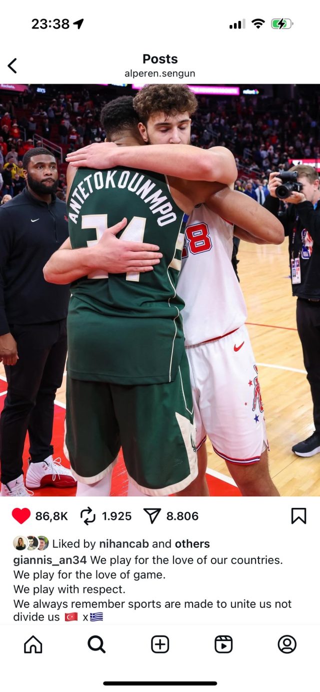 Özür mesajının ardından Giannis ve Alperen Şengün, birlikte çektirdikleri fotoğrafı paylaştı. İkili, “Ülkelerimize olan sevgimiz için oynarız. Oyuna olan sevgimiz için oynarız. Saygıyla oynarız. Sporun bizi bölmek değil, birleştirmek için var olduğunu hatırlatırız.” mesajını yayımladı.