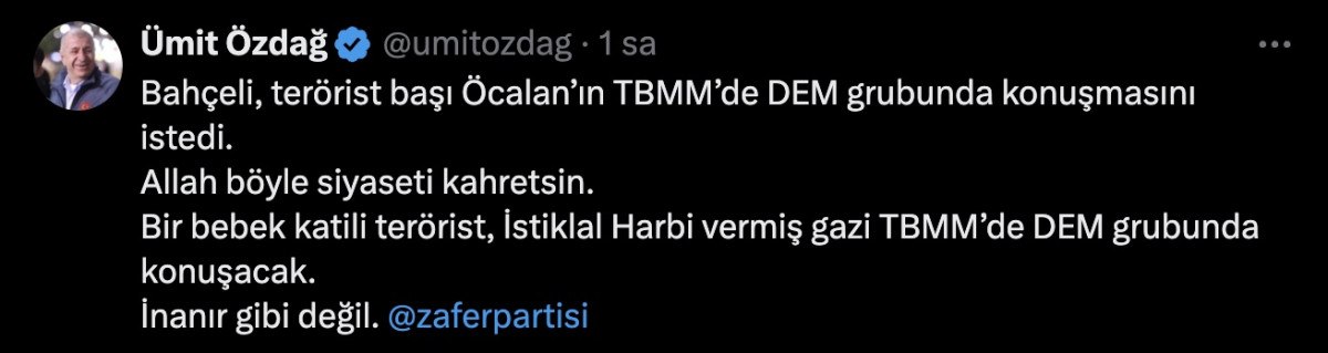 X hesabından Bahçeli’nin sözlerini paylaşan Özdağ, ifadelerini kullandı.