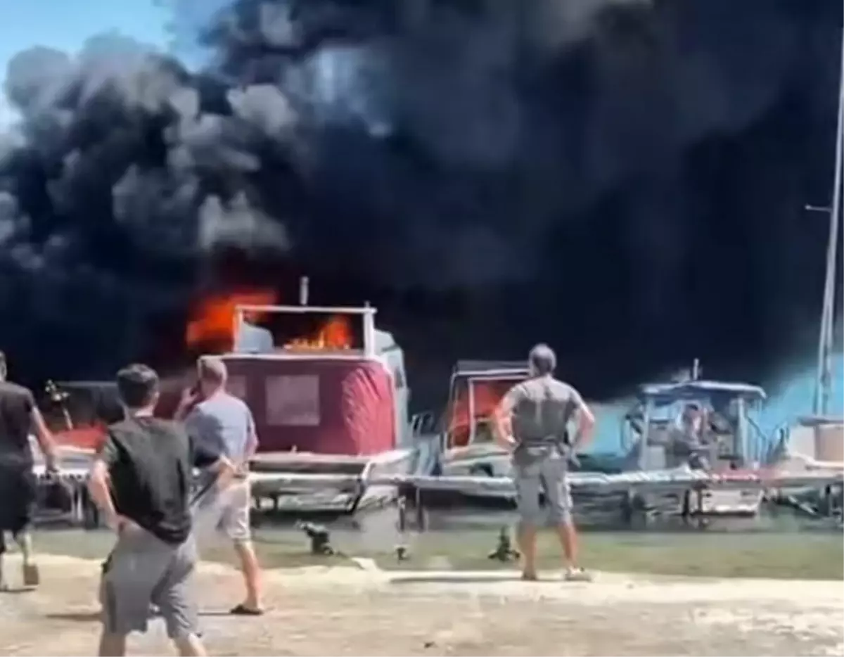 İzmir'in Urla ilçesinde bir teknede çıkan yangın, diğer teknelere sıçradı; itfaiye müdahale ediyor.