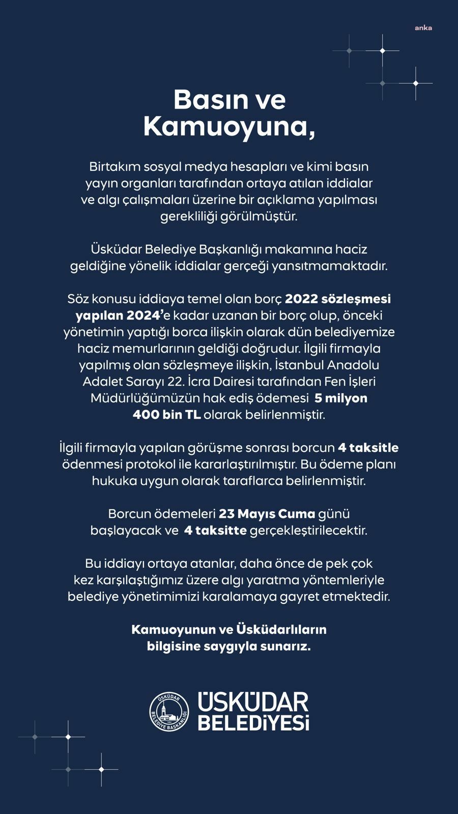 Açıklamada, “İstanbul Anadolu Adalet Sarayı 22. İcra Dairesi tarafından Fen İşleri Müdürlüğümüzün hak ediş ödemesi 5 milyon 400 bin TL olarak belirlenmiştir. İlgili firmayla yapılan görüşmeler sonucu borcun dört taksitte ödenmesi konusunda mutabakata varılmıştır. Ödeme planı hukuka uygun şekilde taraflarca imza altına alınmıştır” denildi.