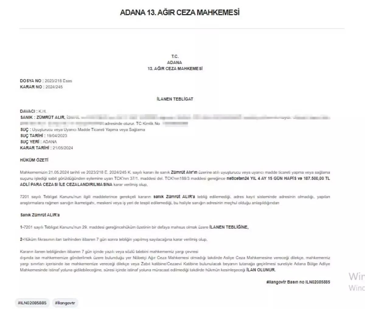 ADANA’da, Zümrüt Alır’a (27) uyuşturucu ticareti suçundan 24 yıl 4 ay 15 gün hapis cezasının gerekçeli kararı, sanık tüm aramalara rağmen bulunamadığı için mahkeme tarafından internet sitesine verilen ilanla tebliğ edildi.