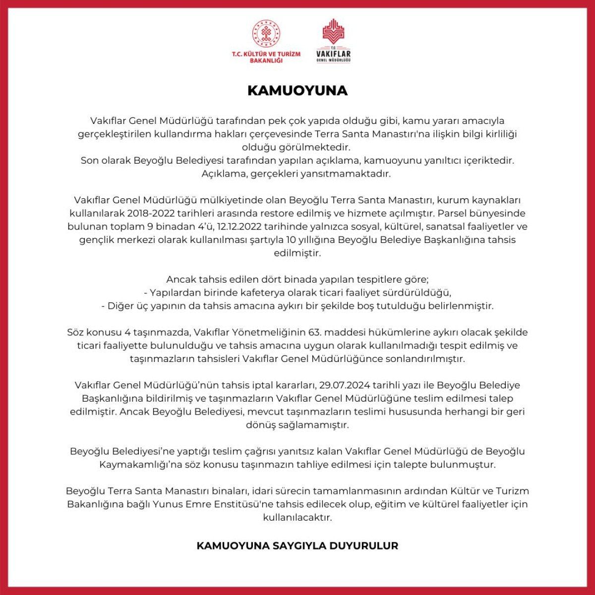 Vakıflar Genel Müdürlüğü, Terra Santa Manastırı’nın 2018-2022 yılları arasında restore edilerek hizmete açıldığını belirtti. Tahsis edilen dört binada yapılan incelemeler sonucunda, birinin kafeterya olarak ticari faaliyet yürüttüğü ve diğer üç yapının boş bırakıldığı tespit edildi. Bu durum, Vakıflar Yönetmeliği’nin 63. maddesine aykırı olarak değerlendirildi ve tahsislerin sonlandırılmasına karar verildi.