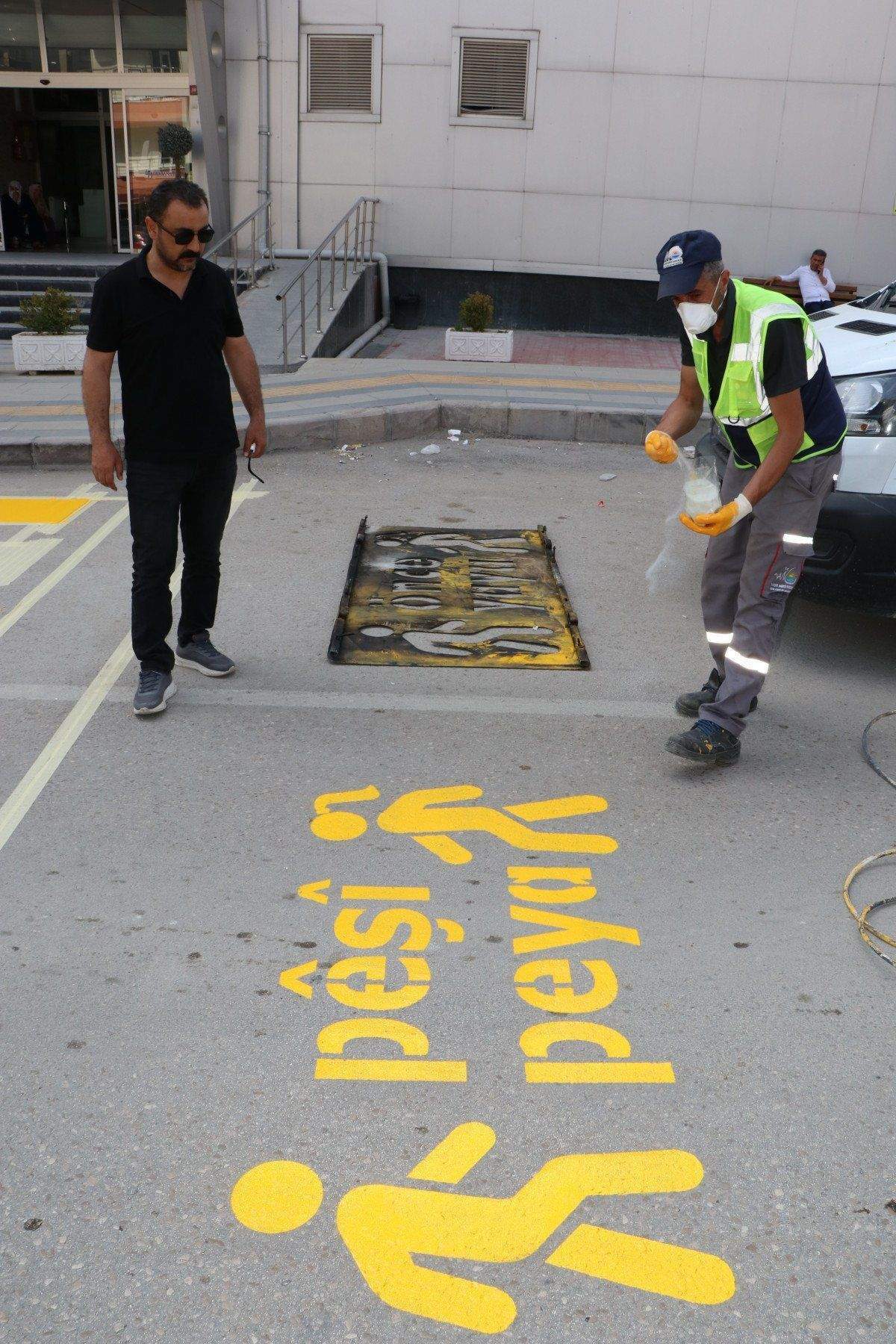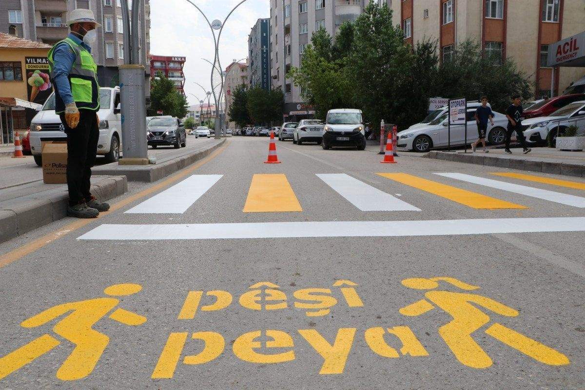 Büyükşehir Belediyesi Ulaşım Daire Başkanlığına bağlı Trafik Hizmetleri Şube Müdürlüğü ekipleri tarafından, kentin birçok caddesinde yaya geçitlerine Türkçe ‘Önce yaya’ anlamına gelen Kürtçe uyarı yazıları yazıldı.