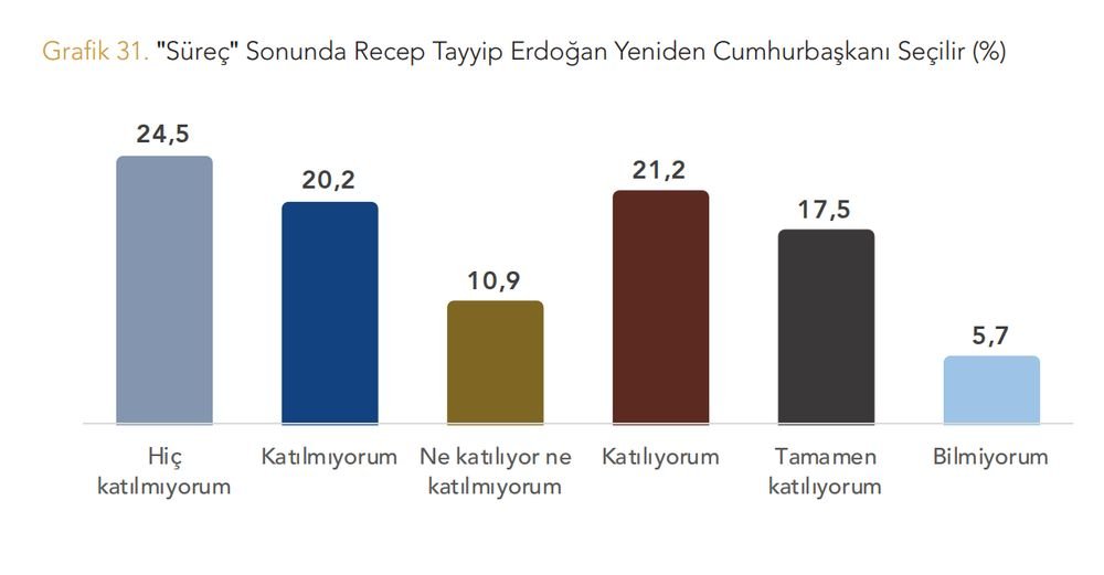 Kömürcü’nün paylaştığı anket sonucuna göre katılanların yalnızca yüzde 21,2’si sürecin sonunda Erdoğan’ın yeniden Cumhurbaşkanı seçileceğine ‘katıldığını’, yüzde 17,5’i ise ‘tamamen katıldığını’ belirtti. Buna karşılık, yüzde 24,5 ‘hiç katılmadığını’, yüzde 20,2 ‘katılmadığını’ ifade etti.