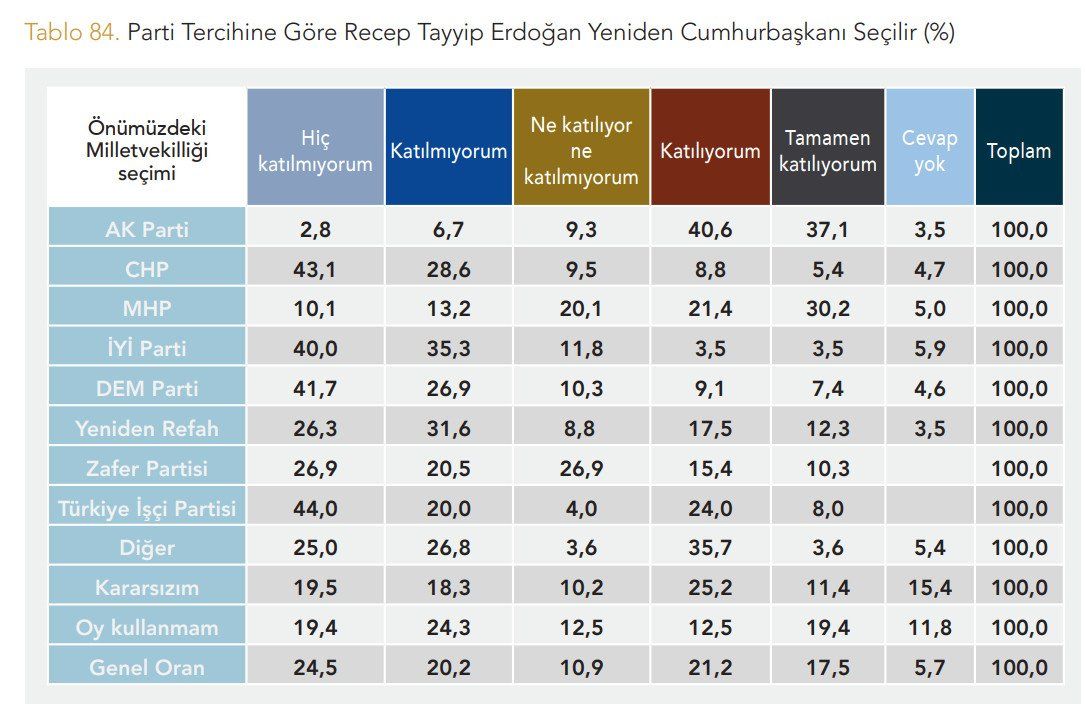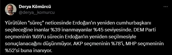 “Yürütülen “süreç” neticesinde Erdoğan’ın yeniden cumhurbaşkanı seçileceğine inanlar %39 inanmayanlar %45 seviyesinde. DEM Parti seçmeninin %69’u sürecin Erdoğan’ın yeniden seçilmesiyle sonuçlanacağını düşünmüyor. AKP seçmeninin %78’i, MHP seçmeninin %52’si buna inanıyor.