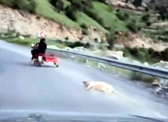 Kahramanmaraş’ta 18 yaşındaki M.G., sepetli motosikletinin arkasına bağladığı köpeği sürüklerken görüntülendi.