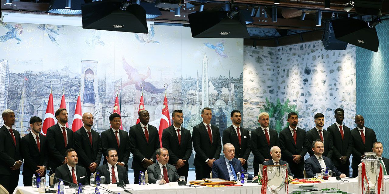 Cumhurbaşkanı Recep Tayyip Erdoğan, Süper Lig’de 2024-2025 sezonunda şampiyonluğa ulaşan Galatasaray’da teknik ekip ve futbolcularla bir araya geldi. Cumhurbaşkanı Erdoğan, Galatasaray’ın heyetini Cumhurbaşkanlığı Dolmabahçe Çalışma Ofisi’nde kabul etti.