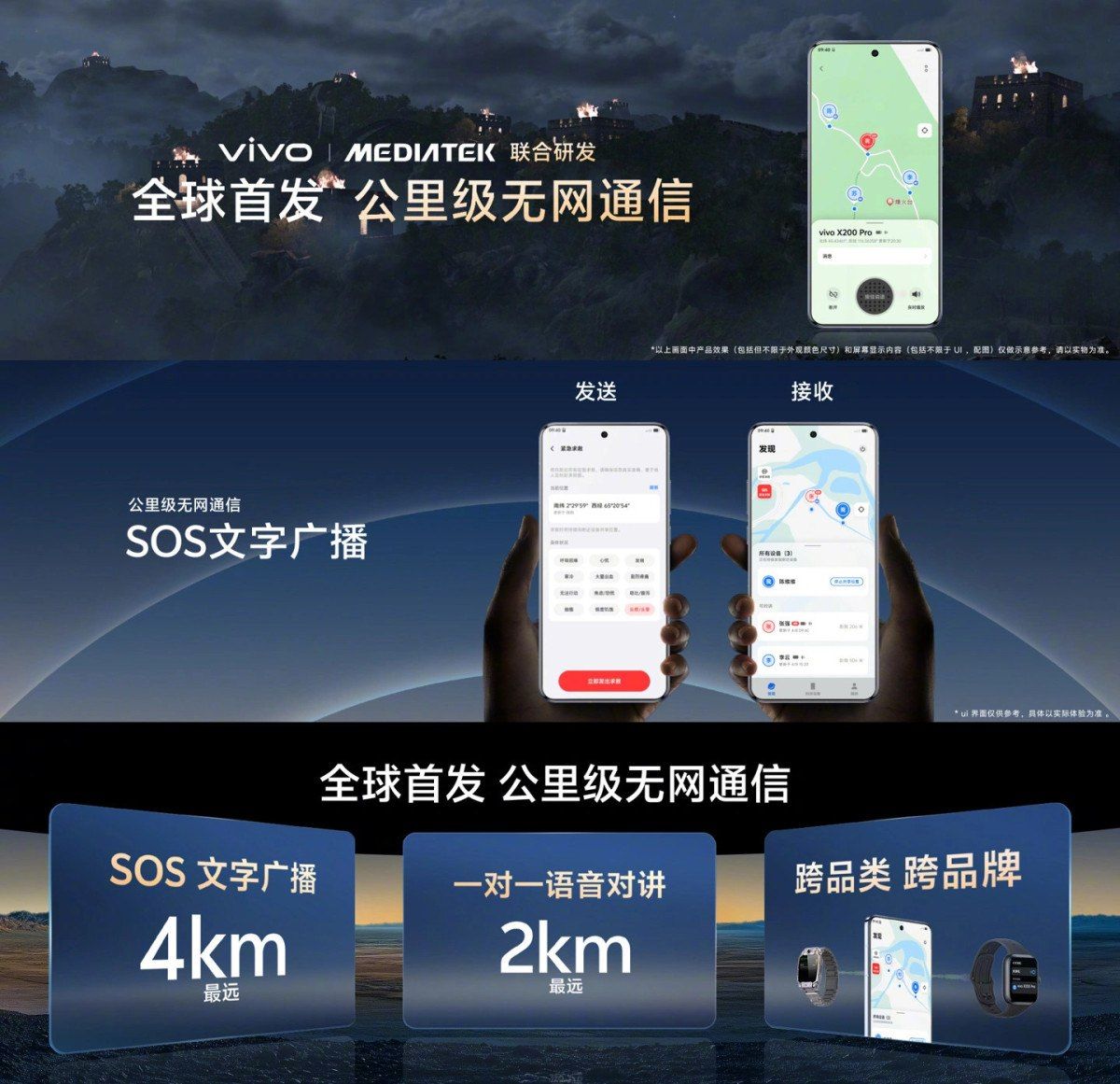 Vivo X200 Pro, kendi geliştirdiği radyo frekansı geliştirme çipleri sayesinde 2 km’ye kadar birebir interkom çağrıları ve 4 km’ye kadar SOS metin yayını yapabiliyor.