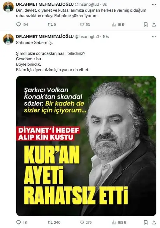 Karadeniz müziğinin önemli ismi, sanatçı Volkan Konak, Kuzey Kıbrıs Türk Cumhuriyeti’nde verdiği konser sonrasında hayatını kaybetmişti. Ünlü sanatçının ani vefatı sevenlerini yasa boğarken Çatalca Müftüsü Ahmet Mehmetalioğlu’nun sosyal medya hesabından yaptığı paylaşım tepkilerin odağı haline gelmişti.