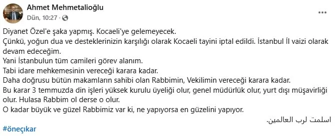 – “Diyanet Özel’e şaka yapmış. Kocaeli’ye gelemeyecek. Çünkü, yoğun dua ve desteklerinizin karşılığı olarak Kocaeli tayini iptal edildi. İstanbul İl vaizi olarak devam edeceğim.
