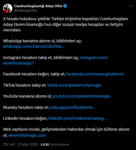 X hesabı hukuksuz şekilde Türkiye erişimine kapatılan Cumhurbaşkanı Adayı Ekrem İmamoğlu’nun diğer sosyal medya hesapları ve iletişim mecraları;