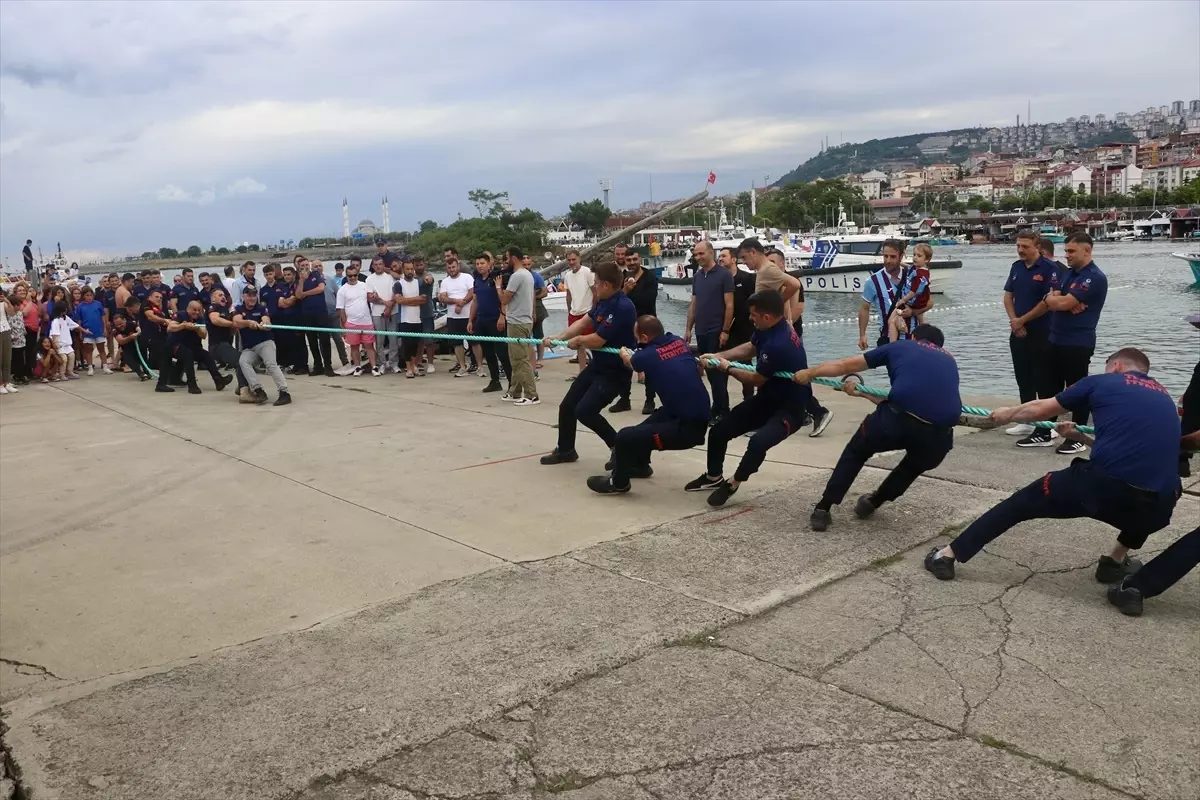 Trabzon Bölge Liman Başkanlığınca Faroz Balıkçı Barınağında yapılan etkinlikte yarışmacılar, gres yağıyla kaplanmış 12 metre uzunluğundaki direğin ucunda asılı bayrağı kapmak için kıyasıya mücadele etti.