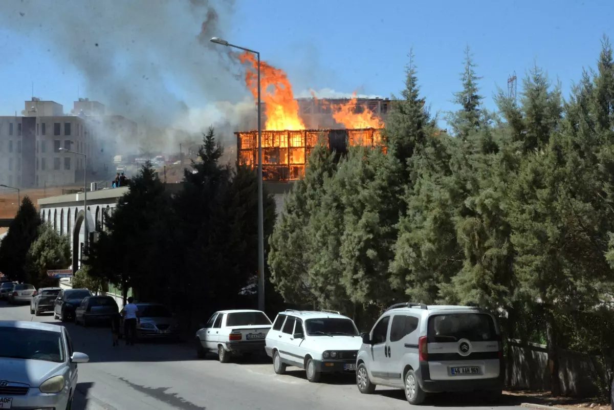Kahramanmaraş’taki lojman inşaatında çıkan yangın devam ederken, alevler yandaki ahşap olarak inşa edilen diğer lojman binasına sıçradı. Ekiplerin her iki binadaki yangına müdahalesi sürüyor.