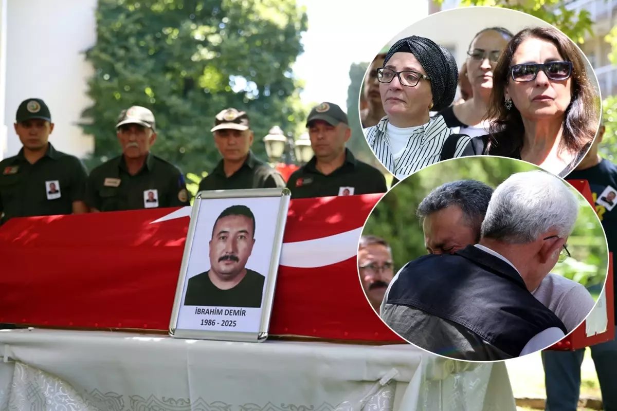 Şehit İbrahim Demir’in Türk bayrağına sarılı tabutu, mesai arkadaşlarının omuzlarında Karşıyaka ilçesindeki İzmir Orman Bölge Müdürlüğü bahçesine getirildi. Orman Genel Müdürü Bekir Karacabey, cenazenin getirilişi sırasında gözyaşı döken Demir’in mesai arkadaşlarını teselli etti.