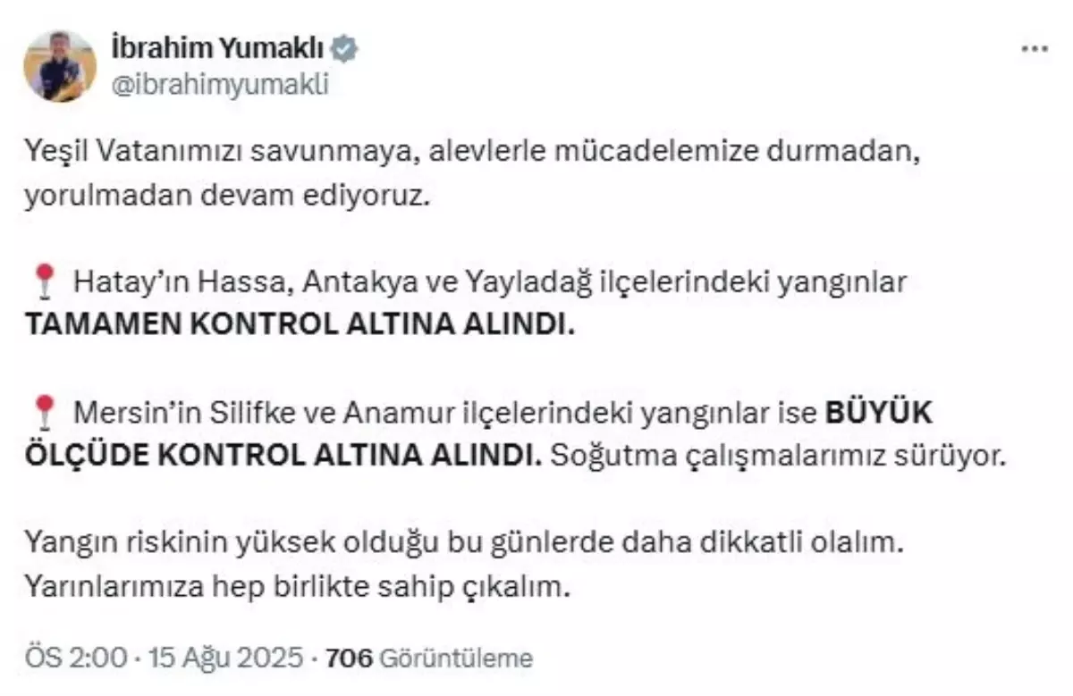 Tarım ve Orman Bakanı İbrahim Yumaklı, sosyal medya hesabından yaptığı açıklamada, “Yeşil vatanımızı savunmaya, alevlerle mücadelemize durmadan, yorulmadan devam ediyoruz. Hatay’ın Hassa, Antakya ve Yayladağ ilçelerindeki yangınlar tamamen kontrol altına alındı. Mersin’in Silifke ve Anamur ilçelerindeki yangınlar ise büyük ölçüde kontrol altına alındı. Soğutma çalışmalarımız sürüyor. Yangın riskinin yüksek olduğu bu günlerde daha dikkatli olalım. Yarınlarımıza hep birlikte sahip çıkalım” dedi.