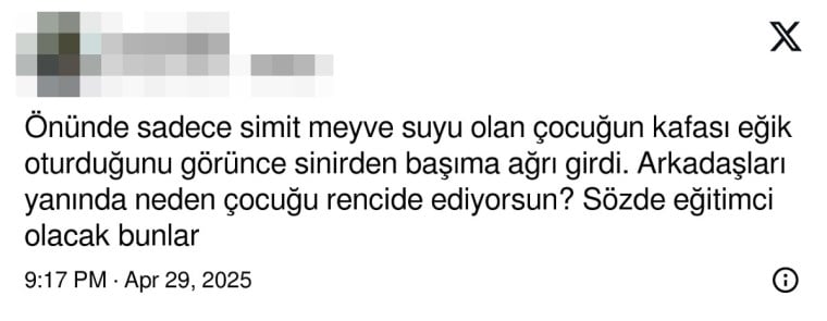Sosyal medyada bir öğretmen tarafından paylaşılan görüntüler ise tepki çekti. Öğretmen, “Beslenme yolculuğu” isimli etkinlikte öğrencilerin beslenme tabaklarını paylaşırken bazı tabakların dolu ve özenli göründüğü, bazılarında ise küçük bir dilim peynir, 2-3 tane zeytin ve bir dilim ekmek bulunduğu görüldü. Bazı öğrencilerin ise öğünü bir simit ya da poğaçayla geçiştirmek zorunda kaldığı görüldü.