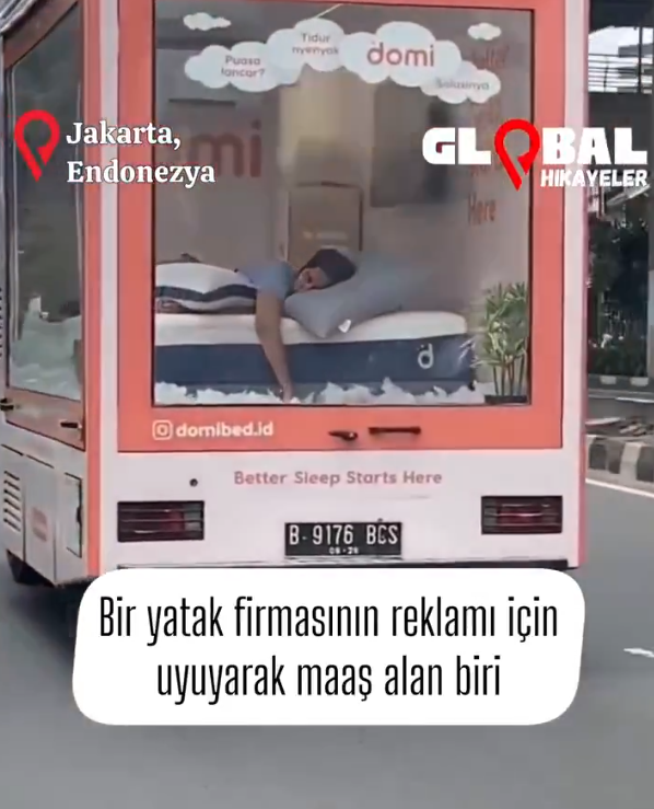 Sosyal medyada hızla yayılan görüntülerde, bir yatak firmasının, ürünlerini tanıtmak amacıyla bir kişiye, hareket halindeki şeffaf bir kamyonetin kasasında uyuması karşılığında maaş ödediği ortaya çıktı.