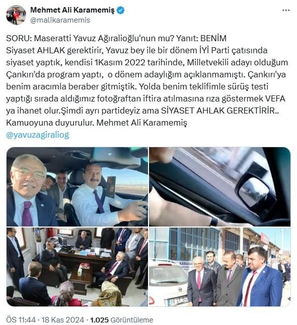 Anahtar Parti Genel Başkanı Yavuz Ağıralioğlu'nun Maserati marka aracın direksiyonunda çekilen fotoğrafı yankı uyandırırken, aracın iş insanı ve siyasetçi Mehmet Ali Karamemiş'e ait olduğu öğrenildi. Karamemiş, "Araç benim. Yavuz bey ile bir dönem İYİ Parti çatısında siyaset yaptık, kendisi 1 Kasım 2022 tarihinde, Milletvekili adayı olduğum Çankırı'da program yaptı. Çankırı'ya benim aracımla beraber gitmiştik. Şimdi ayrı partideyiz ama siyaset ahlak gerektirir." dedi.