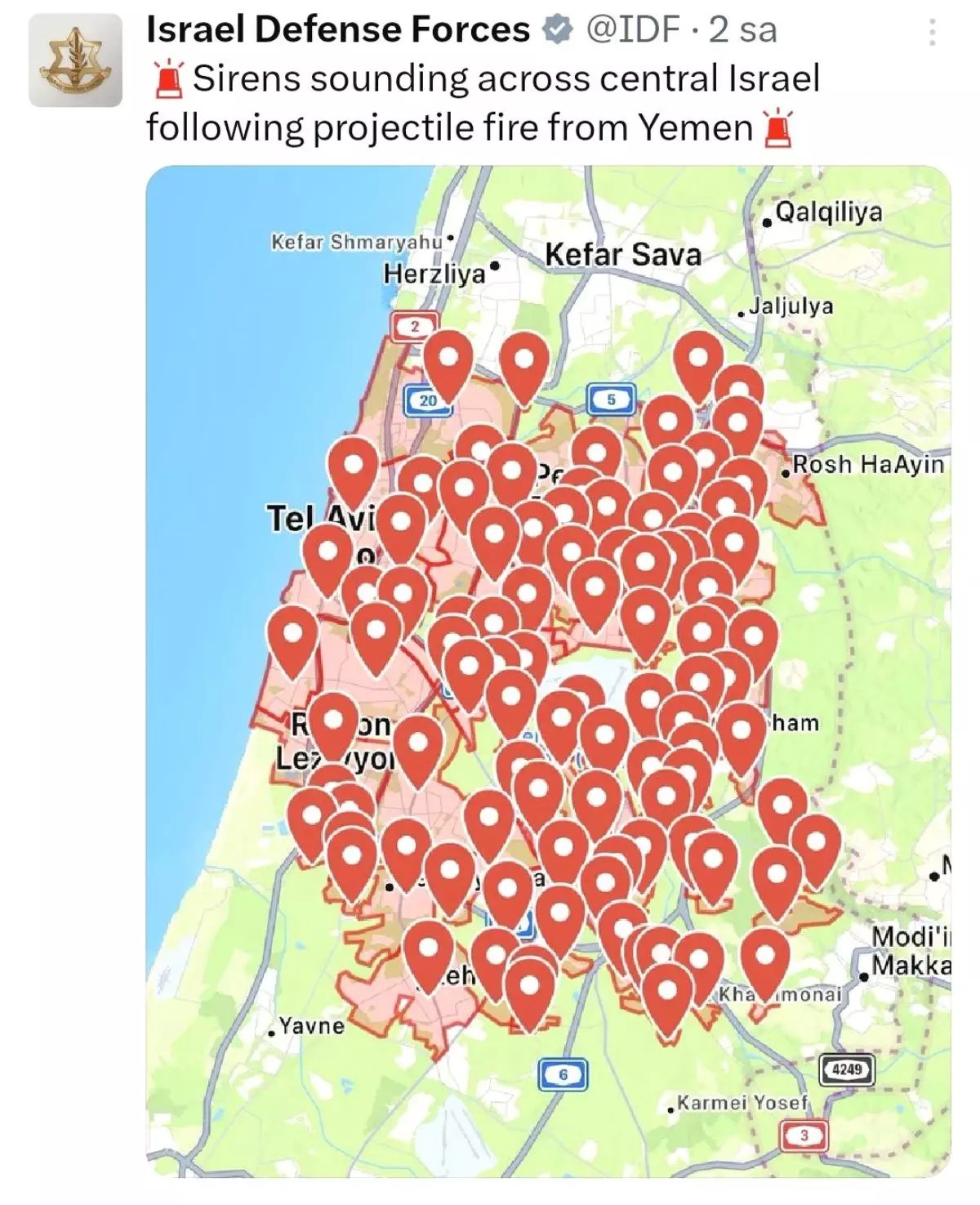 İsrail ordusu, Yemen’den fırlatılan bir füze nedeniyle ülkenin birçok bölgesinde sirenlerin çaldığını duyurdu. Füzenin hava savunma sistemi tarafından engellendiği bildirildi.