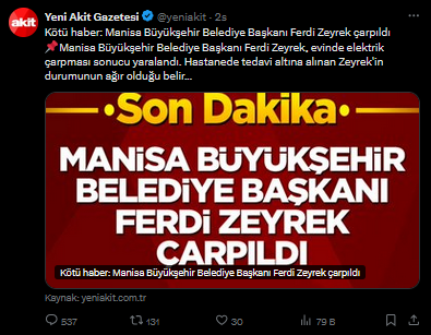 Gazete, sosyal medya hesapları ve internet sitesinde “Manisa Büyükşehir Belediye Başkanı Ferdi Zeyrek çarpıldı” ifadelerini kullandı.