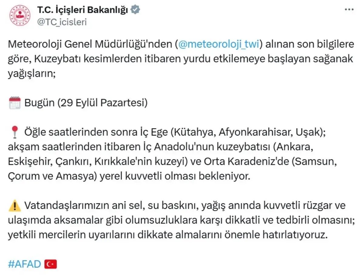 Bakanlığın sosyal medya hesabından yapılan açıklamada, ” Meteoroloji Genel Müdürlüğü’nden alınan son bilgilere göre; kuzeybatı kesimlerden itibaren yurdu etkilemeye başlayan sağanak yağışların; öğle saatlerinden sonra İç Ege ( Kütahya, Afyonkarahisar, Uşak); akşam saatlerinden itibaren İç Anadolu’nun kuzeybatısı ( Ankara, Eskişehir, Çankırı, Kırıkkale’nin kuzeyi) ve Orta Karadeniz’de ( Samsun, Çorum ve Amasya) yerel kuvvetli olması bekleniyor. Vatandaşlarımızın ani sel, su baskını, yağış anında kuvvetli rüzgar ve ulaşımda aksamalar gibi olumsuzluklara karşı dikkatli ve tedbirli olmasını; yetkili mercilerin uyarılarını dikkate almalarını önemle hatırlatıyoruz” denildi.