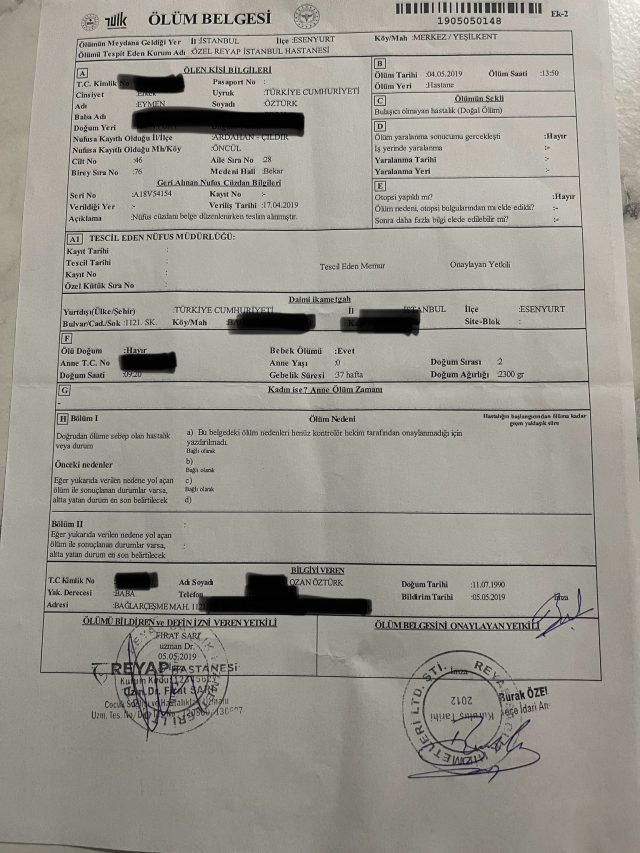 Yenidoğan çetesi lideri Dr. Fırat Sarı tarafından imzalanan oğluna ait ölüm raporunu paylaşan acılı baba, “Sağlıklı olan oğlumu, 24 gün yoğun bakımda tutarak, durumunun her gün daha kötüye gitmesi için elinden geleni yapıp yavrumu öldüren kansızın imzası bu. Ölüm nedenine ‘Doğal ölüm’ yazmışlar! Acımızdan onu bile şimdi fark ediyorum” dedi.