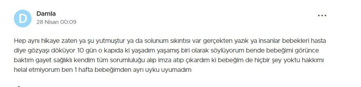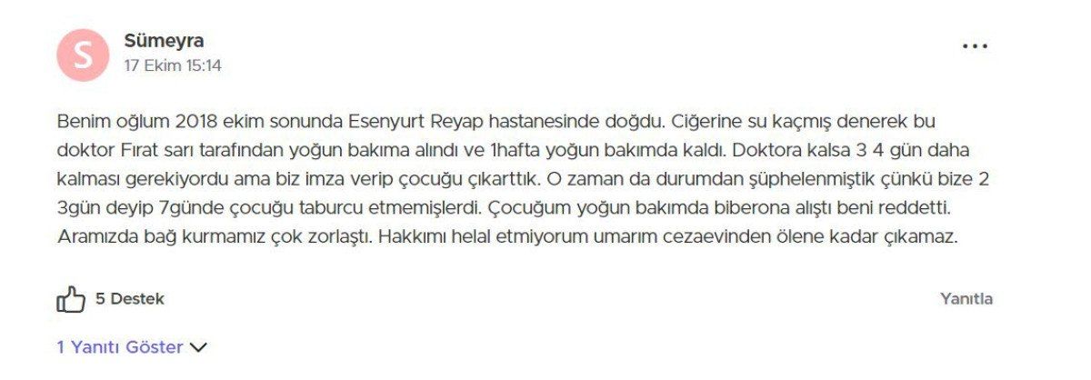 Haberi görünce aklımı yitirdim. 2020 senesinde, doğumdan sonra Fırat Sarı kontrolünde 10 gün yoğun bakımda yattı oğlum ve 10 günün sonunda ne yazık ki vefat etti yavrum. O zamandan beri hep aklımı kurcalar ihmal var mıydı diye. Ben şimdi ne yapayım.