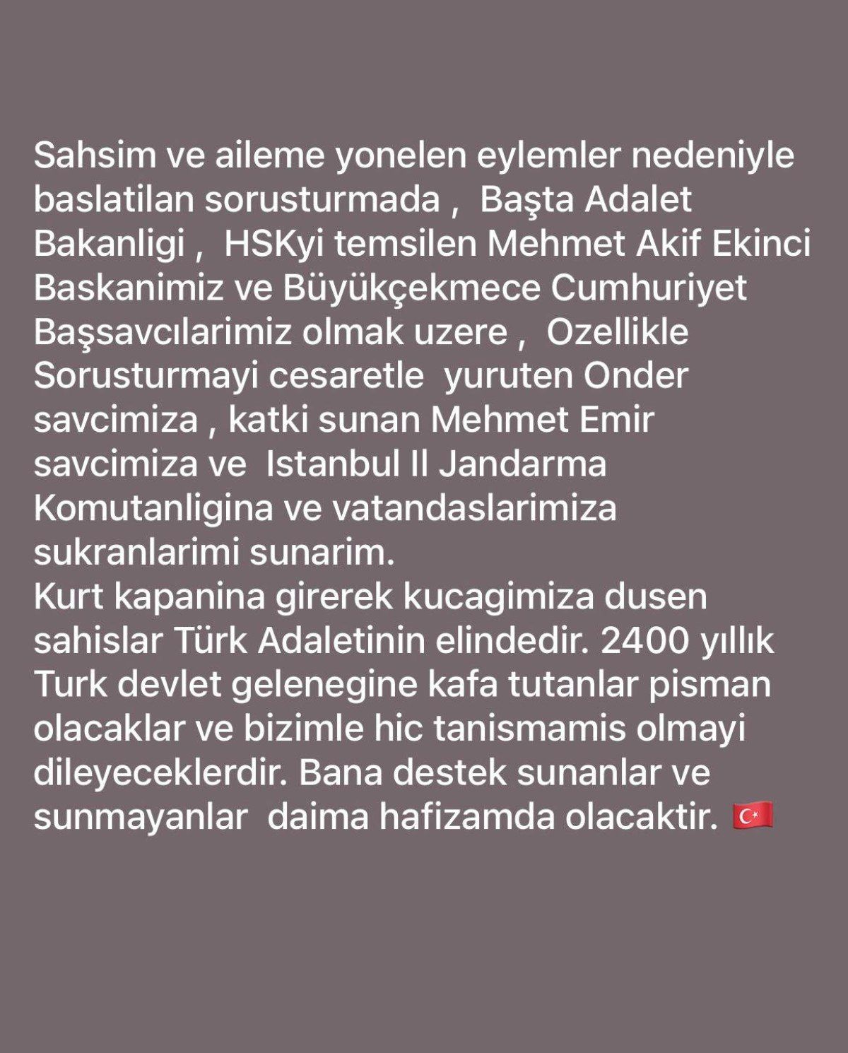 Şahsım ve aileme yönelen eylemler nedeniyle başlatılan soruşturmada, başta Adalet Bakanlığı, HSK’yı temsilen Mehmet Akif Ekinci Başkanımız ve Büyükçekmece Cumhuriyet Başsavcılarımız olmak üzere, özellikle soruşturmayı cesaretle yürüten Önder savcımıza, katkı sunan Mehmet Emir savcımıza ve İstanbul İl Jandarma Komutanlığı’na ve vatandaşlarımıza şükranlarımı sunarım.