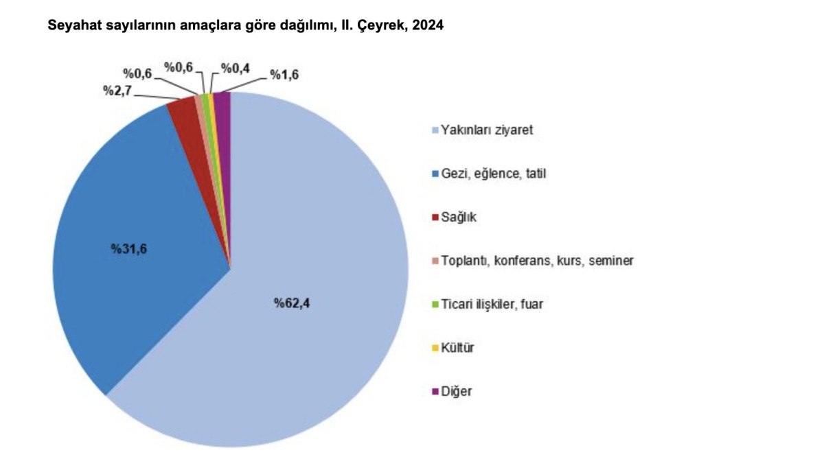 Yakınları ziyaret amacı ile yapılan seyahatler yüzde 62,4 ile ilk sırada yer aldı. Seyahate çıkış amaçlarında ikinci sırada yüzde 31,6 ile “gezi, eğlence, tatil”, üçüncü sırada ise yüzde 2,7 ile “sağlık” yer aldı.