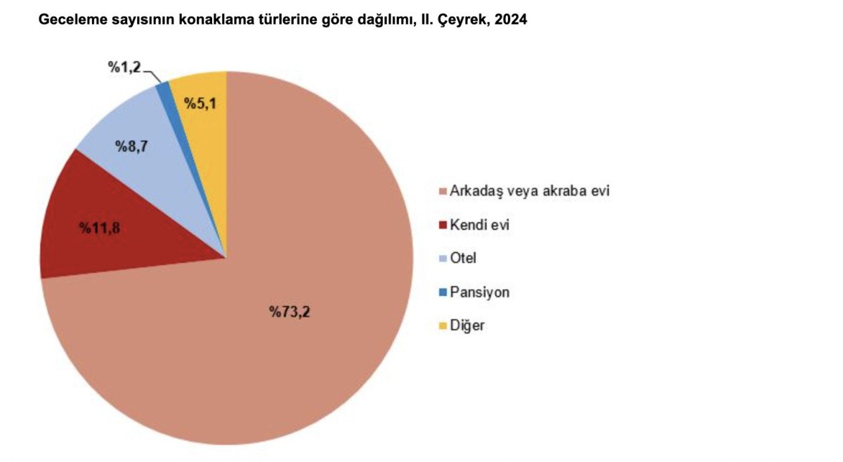 Konaklama türlerine göre geceleme sayısında ikinci sırada 13 milyon 925 bin geceleme ile “kendi evi” yer alırken, “otel” 10 milyon 308 bin geceleme sayısı ile üçüncü sırada yer aldı.
