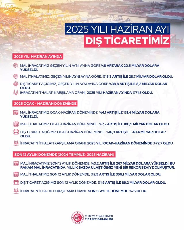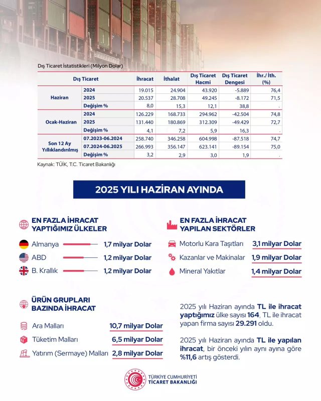Ticaret Bakanı Ömer Bolat, haziran ayı dış ticaret rakamlarına ilişkin basın toplantısı düzenledi. Bakan Bolat, yılın ilk 6 ayında en yüksek ihracat artışının Haziran ayında yaşandığını açıkladı. Bolat, “Haziran ayı itibariyle yıllık ihracatımızı yüzde 3,2 artırarak 267 milyar dolarla Cumhuriyet tarihi rekoru kırdık” dedi.
