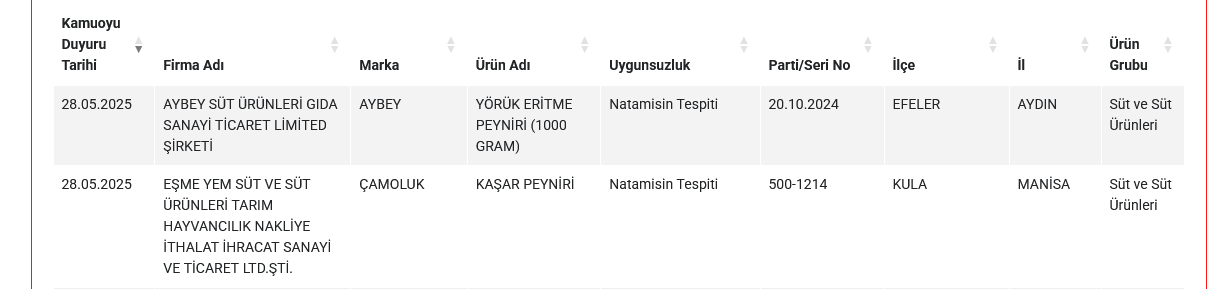 İki peynir bakanlığın açıkladığı “Sağlığı Tehlikeye Düşürecek Gıdalar” listesinde yer aldı. Söz konusu ürünlerde natamisin bulundu.