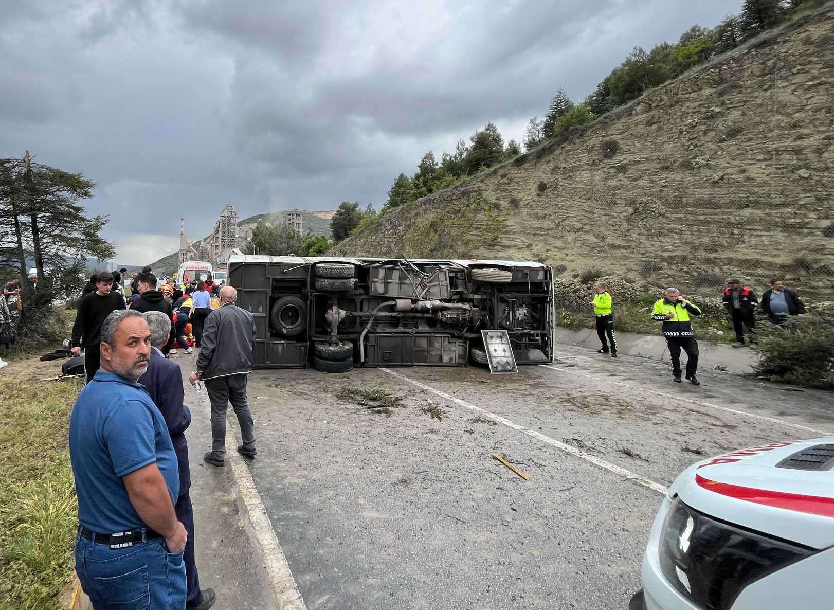 Refüjdeki 2 çam ağacını yıkıp, karşı yöne geçen midibüs yan yatmasıyla meydana gelen kazada 16 kişi yaralandı. Çevredekilerin ihbarı üzerine bölgeye çok sayıda ambulans ve kurtarma ekibi sevk edildi.