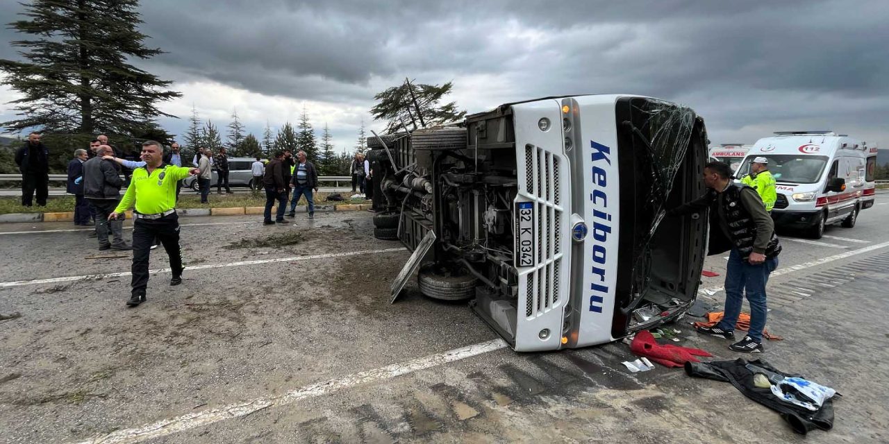 Isparta-Keçiborlu seferini yapan yolcu midibüsü yağış nedeniyle kayganlaşan yolda karşı yola geçerek devrildi.