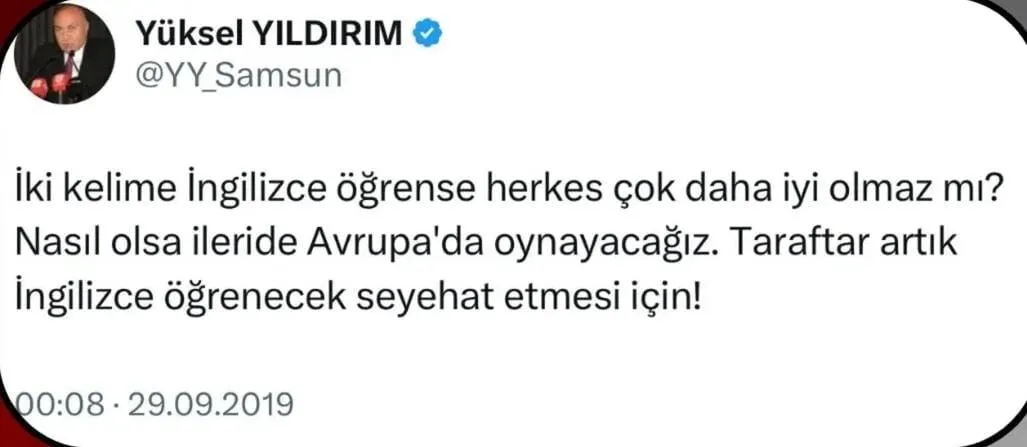 Takımın 2. Lig’de mücadele ettiği dönemde Afyon deplasmanı sonrası sosyal medyada dikkat çeken bir paylaşım yapan Yıldırım, “İki kelime İngilizce öğrense herkes çok daha iyi olmaz mı? Nasıl olsa ileride Avrupa’da oynayacağız. Taraftar artık İngilizce ...