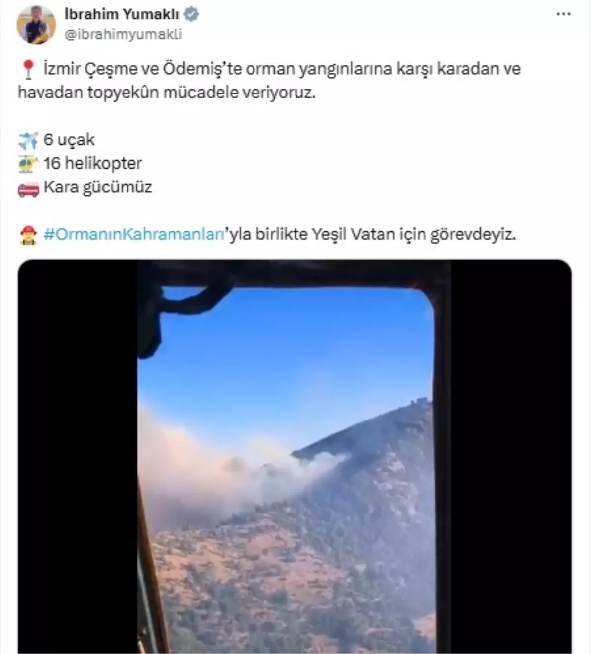 Tarım ve Orman Bakanı İbrahim Yumaklı, Çeşme ve Ödemiş’teki yangınlara ilişkin sosyal medya hesabından açıklama yaptı. Yumaklı, “İzmir Çeşme ve Ödemiş’te orman yangınlarına karşı karadan ve havadan topyekun mücadele veriyoruz. 6 uçak, 16 helikopter, kara gücümüz; ormanın kahramanlarıyla birlikte Yeşil Vatan için görevdeyiz” dedi.