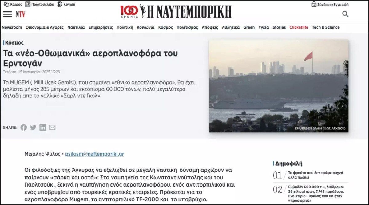 Yunan gazetesi Naftemporiki, Türkiye’nin üretimi için startını verdiği MUGEM milli uçak gemisini haberleştirdi.