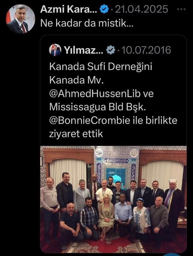 Karamahmutoğlu, Tunç’un Sufi Derneği’ne Kanada Milletvekili Ahmed Hussen ve Missisagua Belediye Başkanı Bonnie Crombie ile ziyaretine dair yaptığı paylaşımı altıntılayarak “Ne kadar mistik…” ifadesini kullandı.