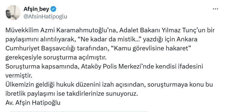 “Müvekkilim Azmi Karamahmutoğlu’na, Adalet Bakanı Yılmaz Tunç’un bir paylaşımını alıntılıyarak, “Ne kadar da mistik…” yazdığı için Ankara Cumhuriyet Başsavcılığı tarafından, “Kamu görevlisine hakaret” gerekçesiyle soruşturma açılmıştır. Soruşturma kapsamında, Ataköy Polis Merkezi’nde kendisi ifadesini vermiştir. Ülkemizin geldiği hukuk düzenini izah açısından, soruşturmaya konu bu ibretlik paylaşımı ise takdirlerinize sunuyoruz.”