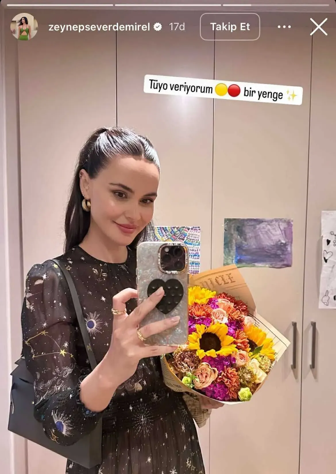 Sosyal medya hesabından paylaşım yapan Demirel, kendisine çiçek gönderen kişinin kim olduğunu ilk etapta açıklamazken, “Tüyo veriyorum, bir yenge” ifadeleriyle takipçilerini meraklandırdı.